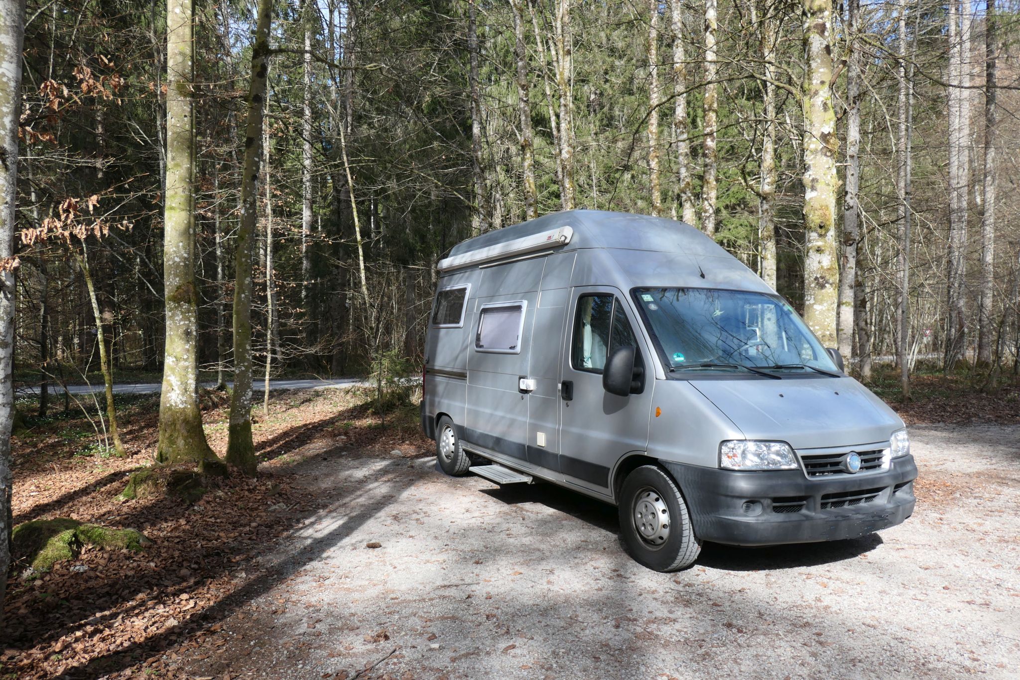Ich werfe also Wanderschuhe, Frischwasser und Bettdecken in Hector, starte die Maschine und bin kurz darauf am Sylvenstein. Zwischen dem westlichen und dem östlichen Teil des Speichersees parken wir für 10,-€/Nacht inmitten der Bäume – ganz klar einer meiner Lieblings-Stellplätze.