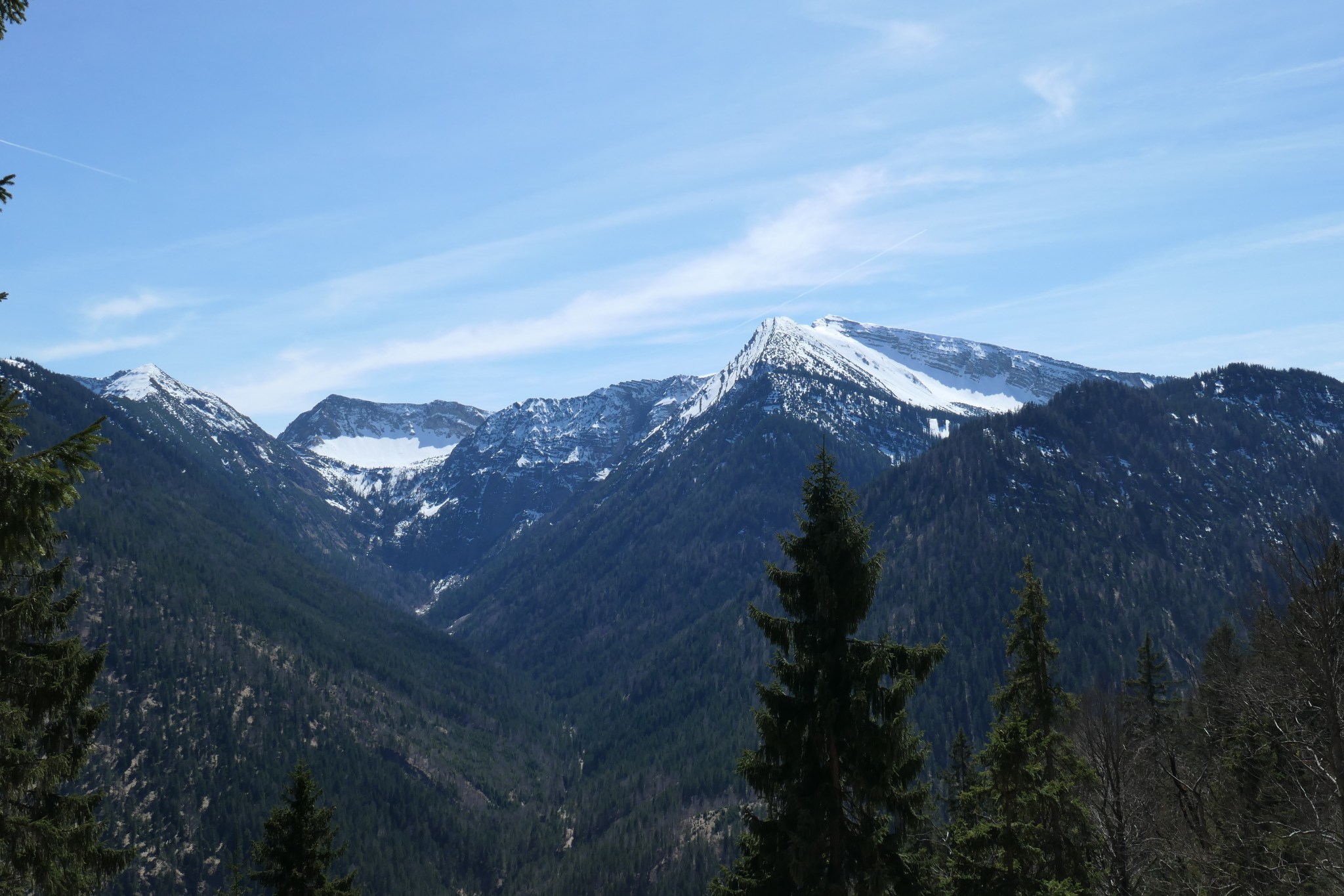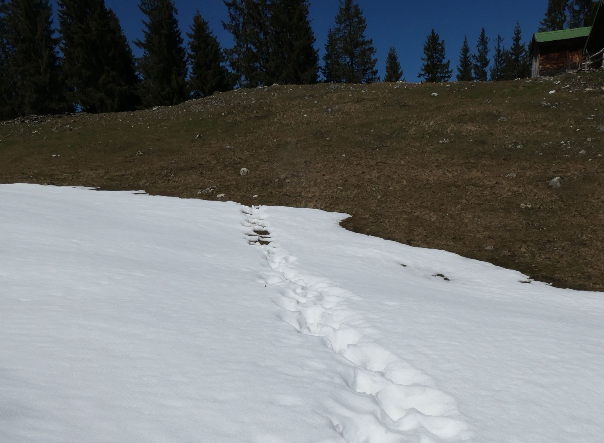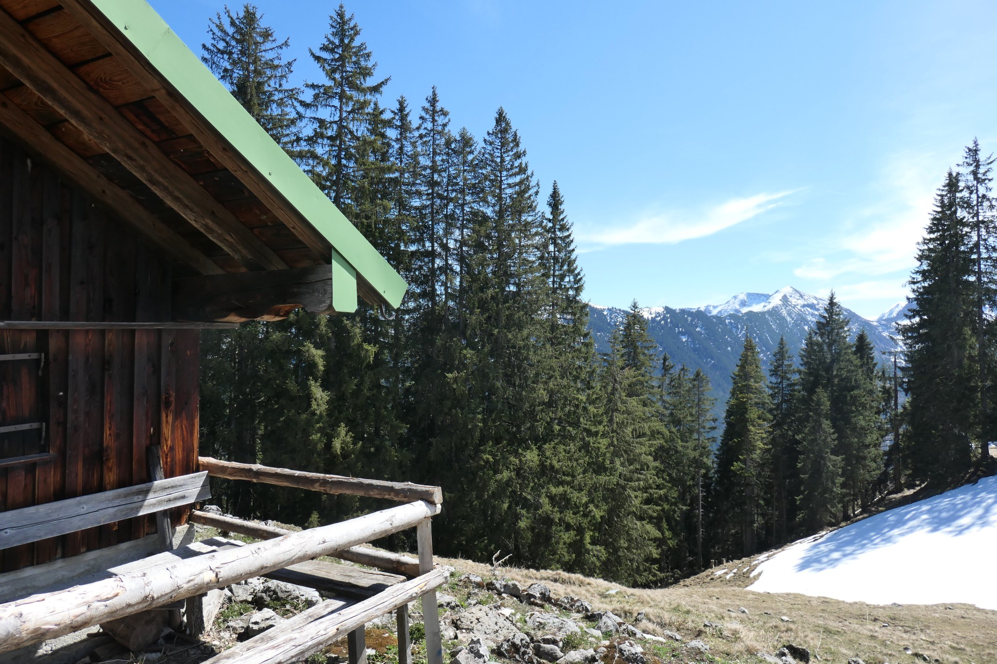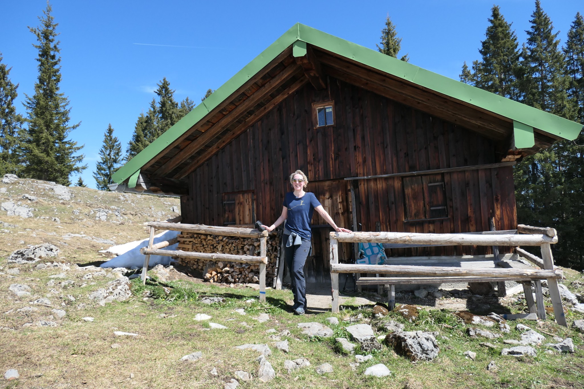 Jede Bergtour ist anders als die vorhergehende, und heute geht es ausschließlich über einfache, breite Wege bis zur Grammersbergalm. So früh im Jahr ist hier oben noch niemand eingezogen, so dass ich die rustikale Holzbank an der Hütte ganz für mich allein habe.