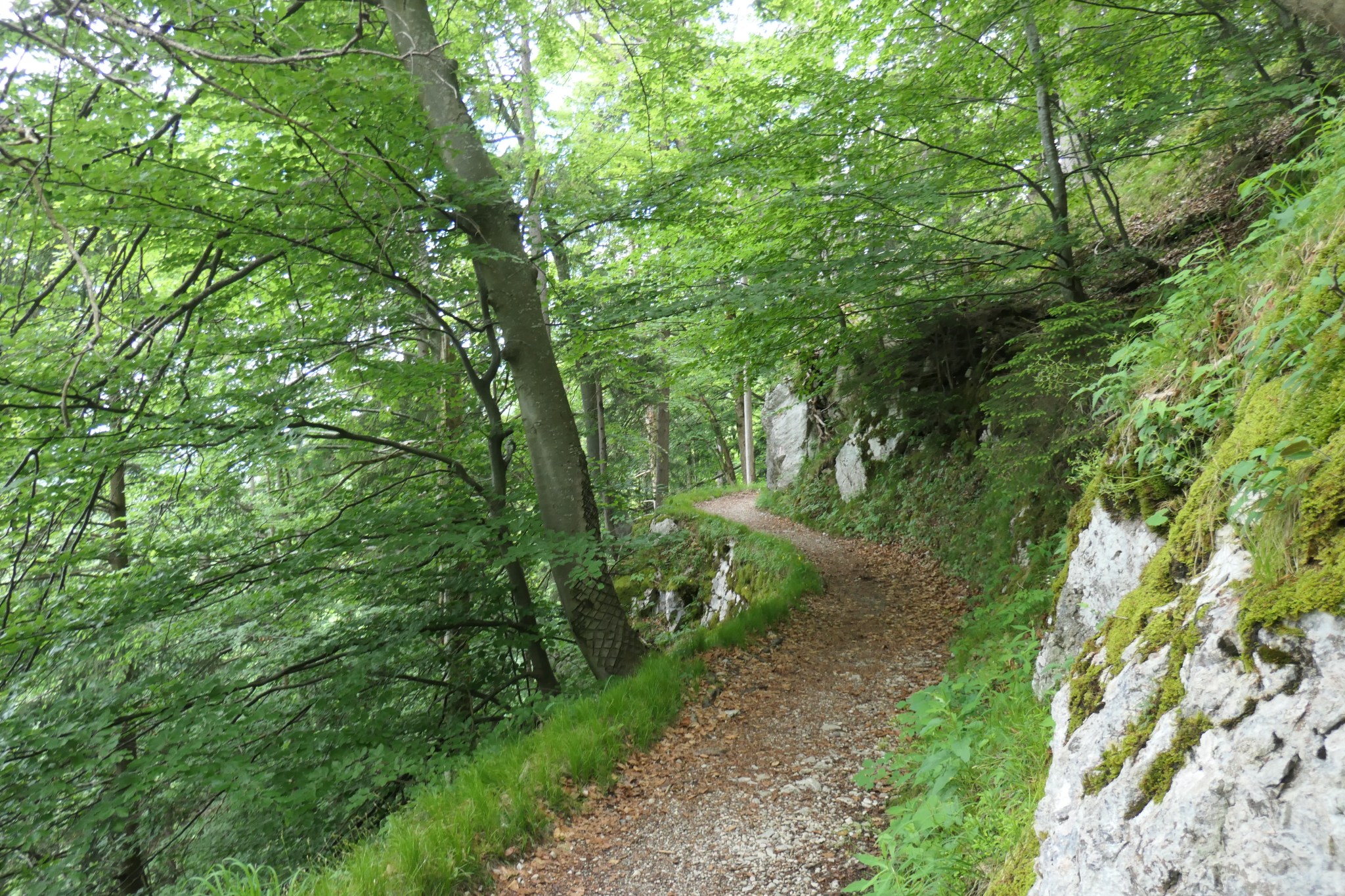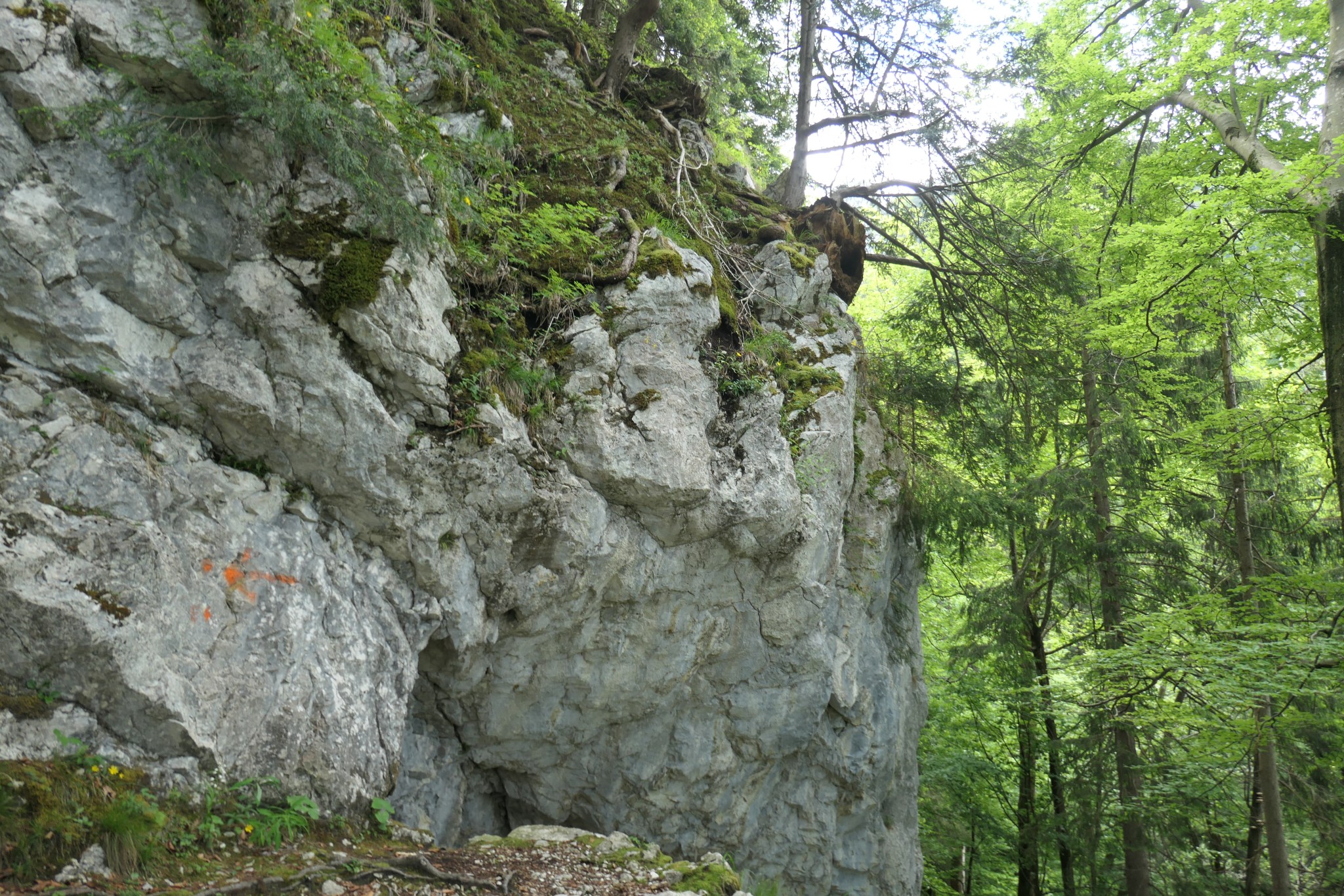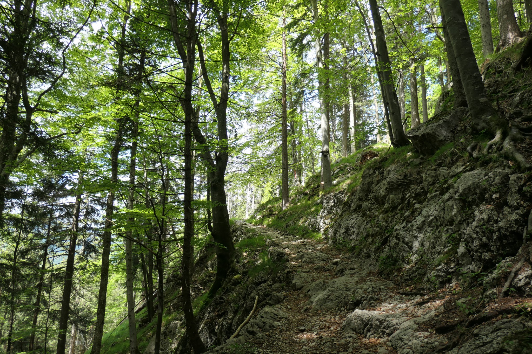 Der Weg kreuzt einen Bergbach und gelangt dann in felsige Höhen. Um jede Verzweigung, Abbiegung und Richtung mitzubekommen, laufe ich ständig meinem Handy hinterher. Um wieder mehr von der Natur zu sehen, stelle ich die Wander-App auf akustische Hinweise um. Jetzt sehe ich auch wieder Wege, Wälder und Felswände.
