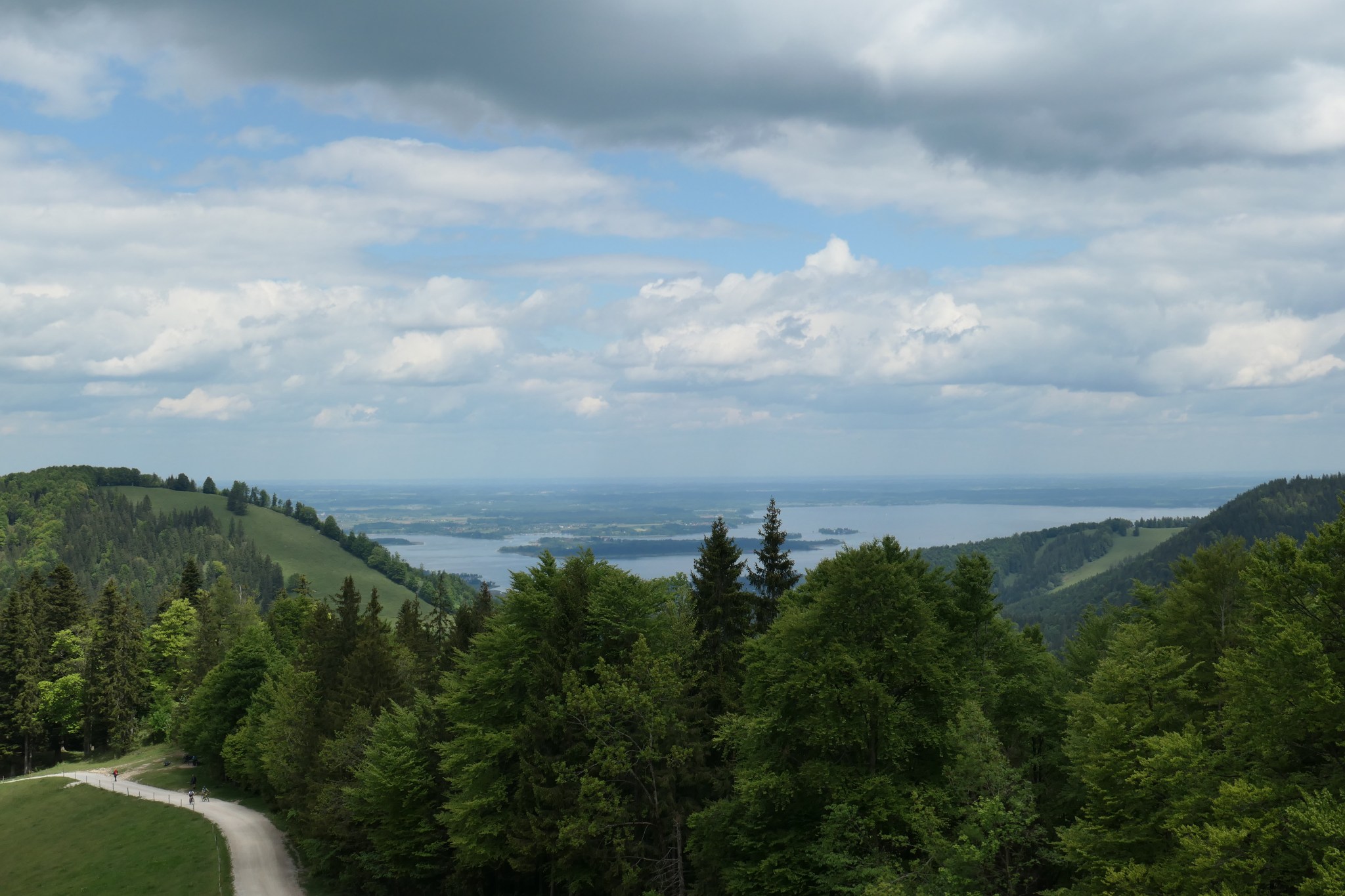 Auf den letzten hundert Höhenmetern schwenkt die Rundtour auf die Haupt-Aufstiegsstraße ein. Einsames Schnaufen ist von nun an vorbei, dafür werde ich mit dem weiten Blick zum Chiemsee belohnt.