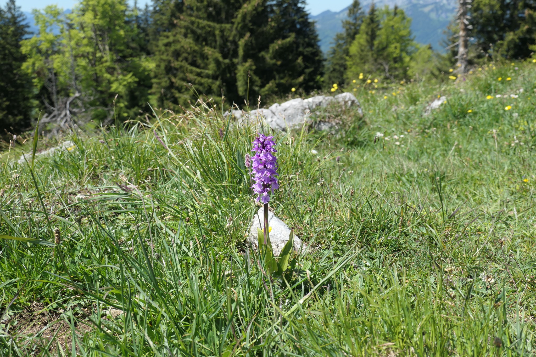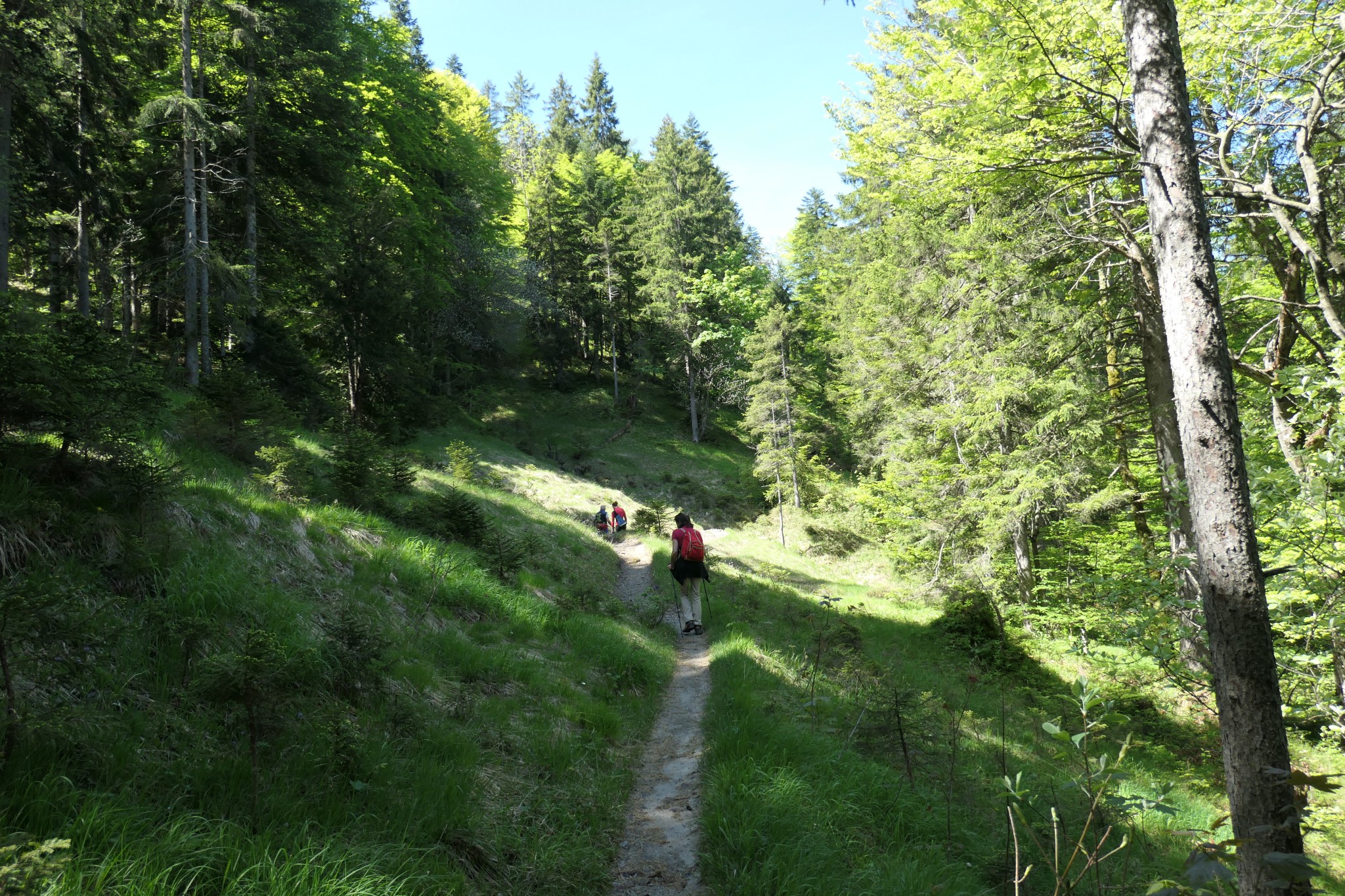 Die beiden, die meine Süd-West/Nord-West-Vertauschung korrigiert haben, sind lange Zeit die einzigen Wanderer auf unserem Weg. Wir lassen ihnen etwas Vorsprung und genießen das Gefühl, durch unseren Privat-Wald zu schlendern. Natürlich hat so ein erträumter Zauberwald auch Enzian entlang des Wegs.