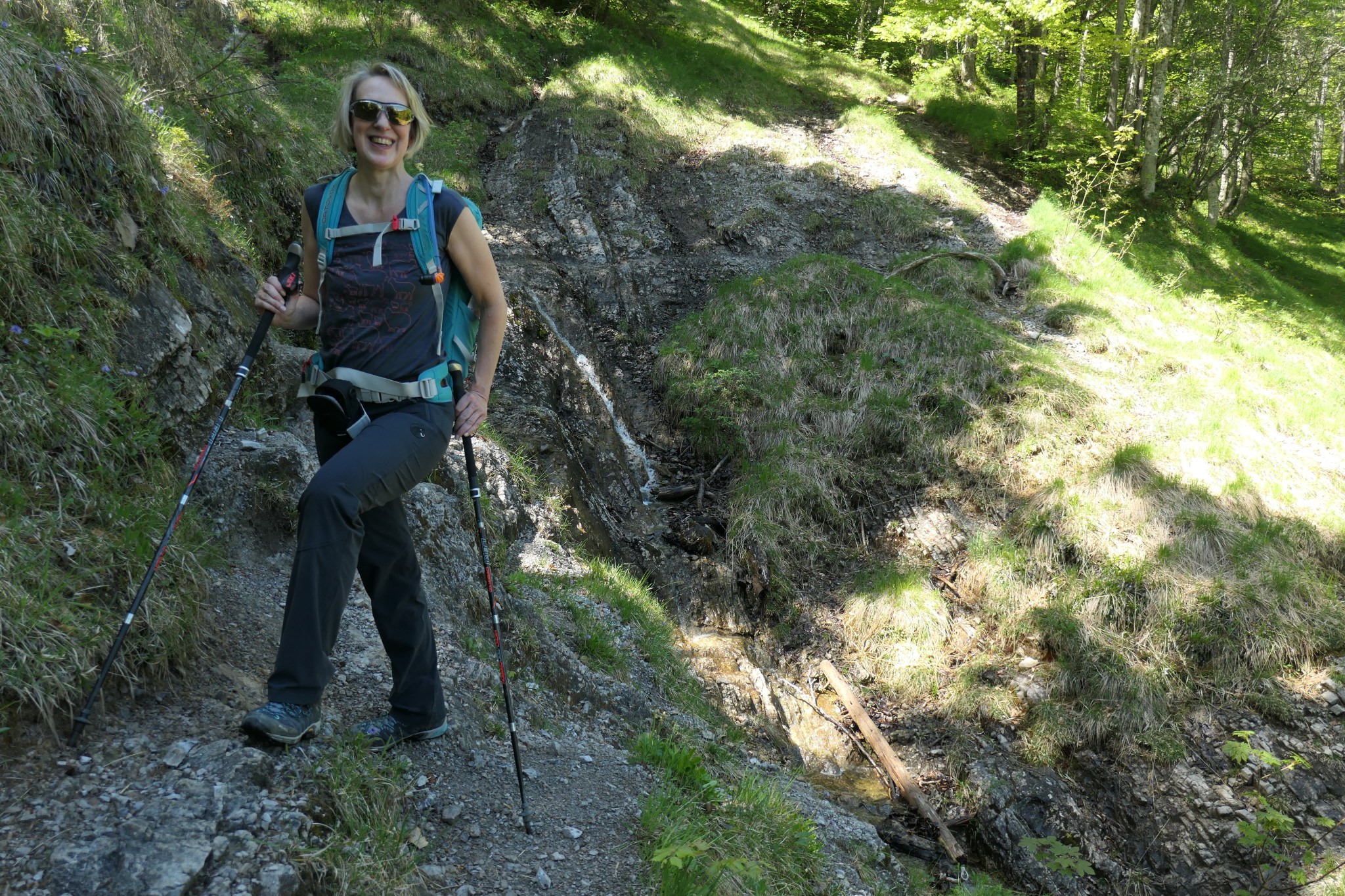 Der schmale Weg kreuzt viele Wasserläufe, die munter den Berg runter plätschern. Ausgetretene Spuren in nassem Fels bringen die kleine Prise Abenteuer rein, ohne die es gar zu weichgespült wäre.