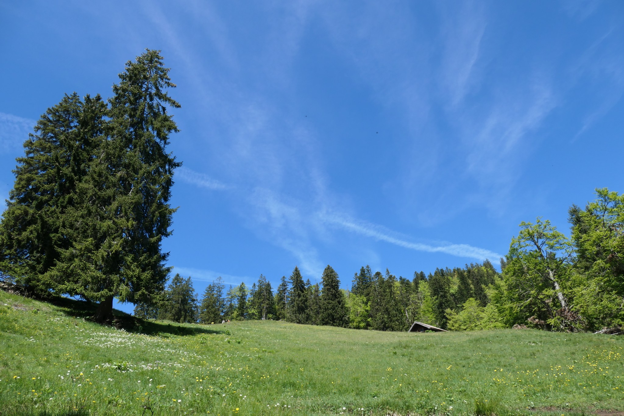 Weiter oben erreichen wir die Hölleialm, die noch verwaist ist. Saftige Wiesen, zauberhafte Aussicht, aber keine Kuhglocke weit und breit.