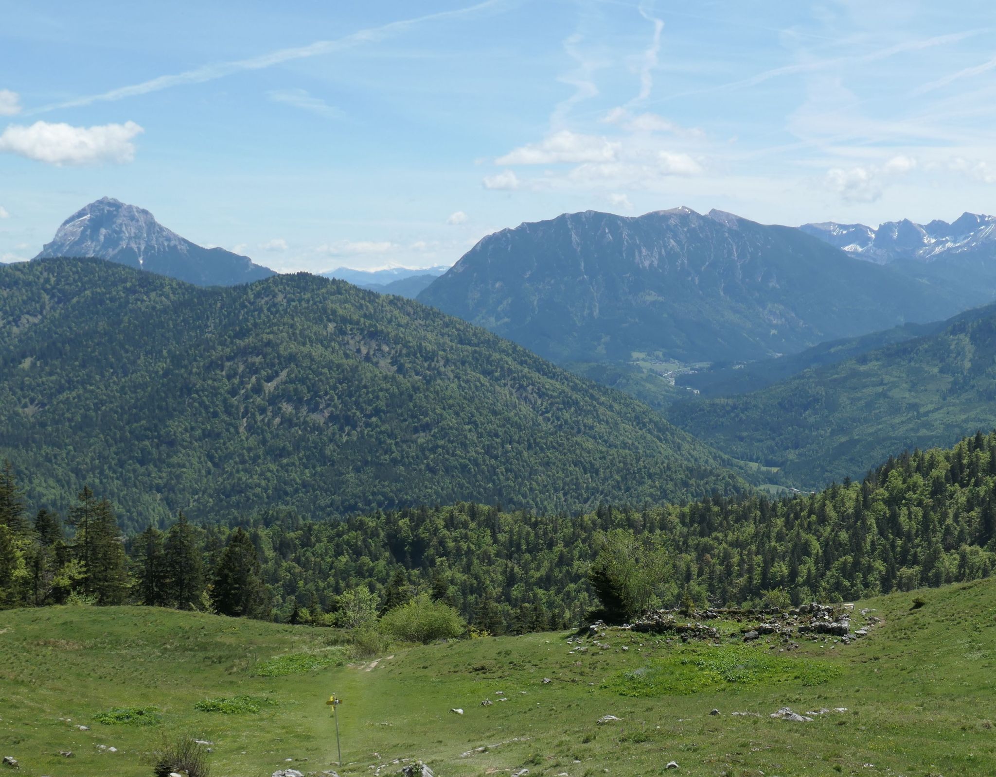 Half way up is the Hölleialm, a private, currently deserted mountain pasture chalet. Already here, on 1.154m, we have a nice lookout to neighboured peaks.
