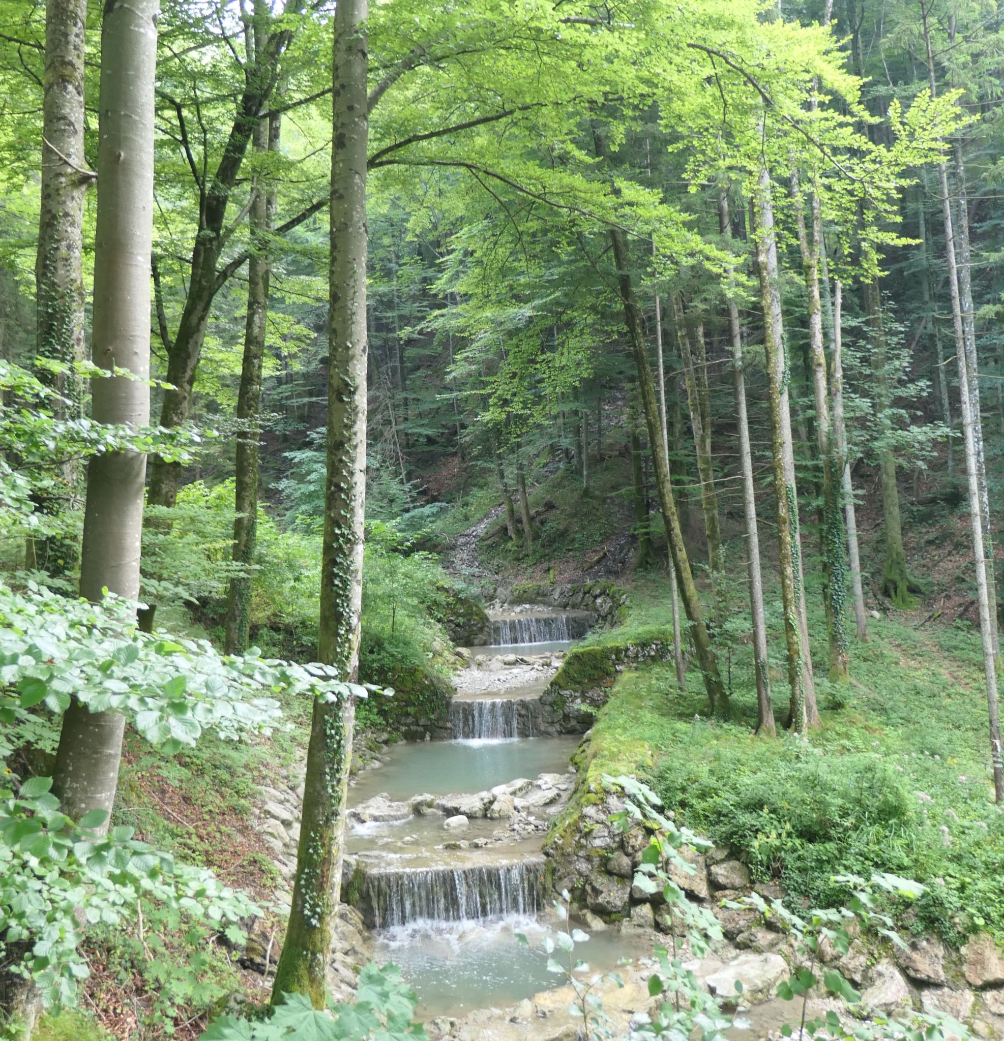 Als es dann bergauf geht, ist es gleich mächtig steil. Ich bin froh um den schattigen Wald und transpiriere dennoch ganz ordentlich. Sieht bestimmt ähnlich malerisch aus wie die kleinen Wasserfall-Stufen des Bergbachs… Zum Glück begegne ich unterwegs kaum anderen Lebewesen, daher ist es eh wurscht.