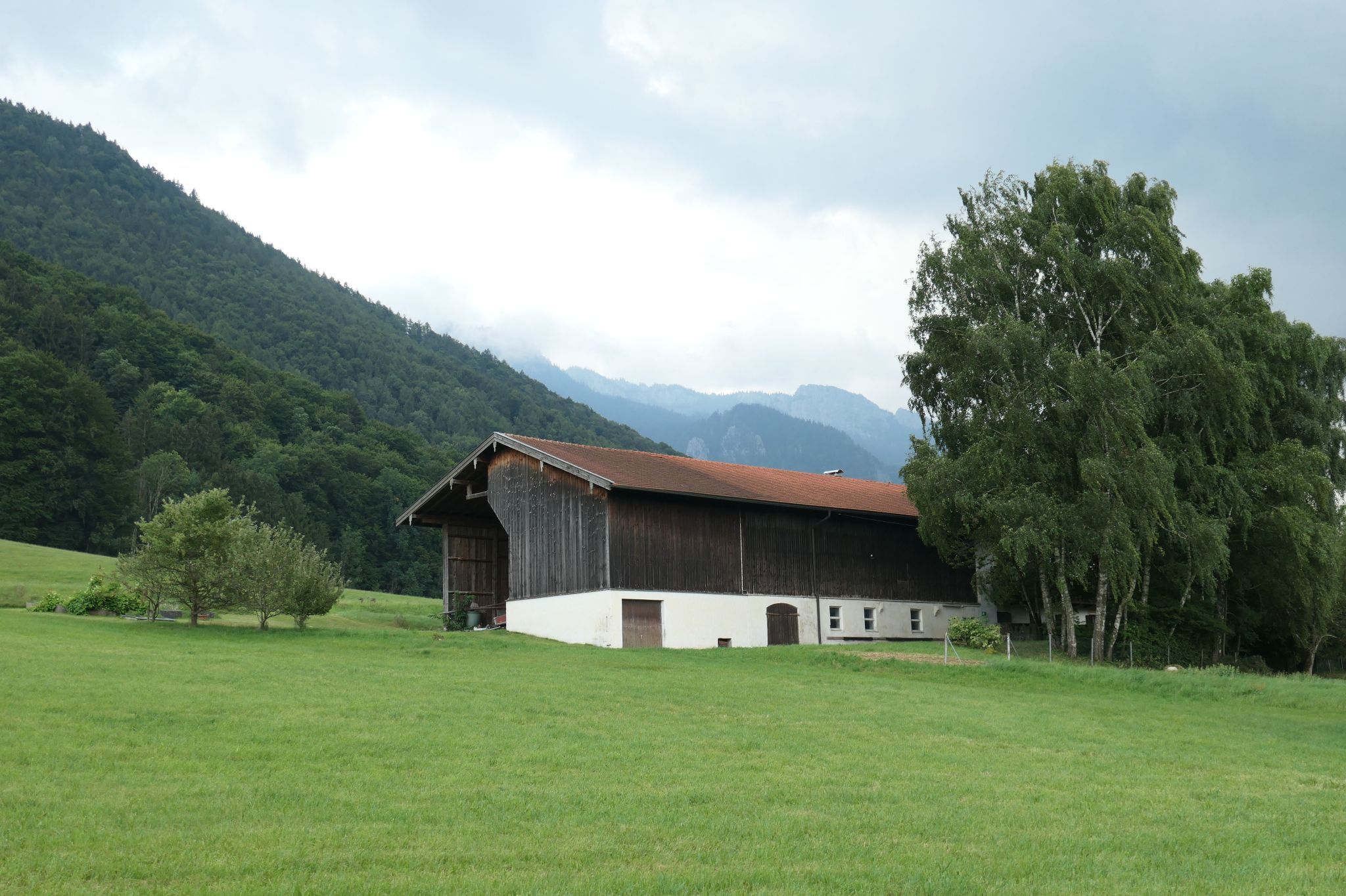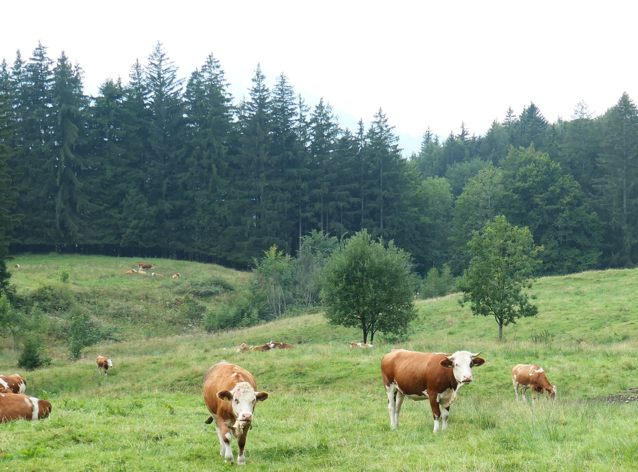 Erst auf Höhe der Maisalm treffe ich auf Wanderer, Mountainbiker und jede Menge Kühe. Von hier aus könnte ich weitere 90 Minuten stramm bergauf stapfen und käme zur Kampenwand – aber da war ich schon, und heute hängt sie eh in den Wolken. Viel wichtiger ist mir der heutige Nachweis meiner Fitness: erstmals seit einem Dreivierteljahr wandere ich ohne Bandage UND ohne Stöcke. Herrlich, wieder jung zu sein! Das will ich nicht aufs Spiel setzen, und so belasse ich es heute bei einem agrarkulturellen Rundwanderweg mit nur 400 Höhenmetern.