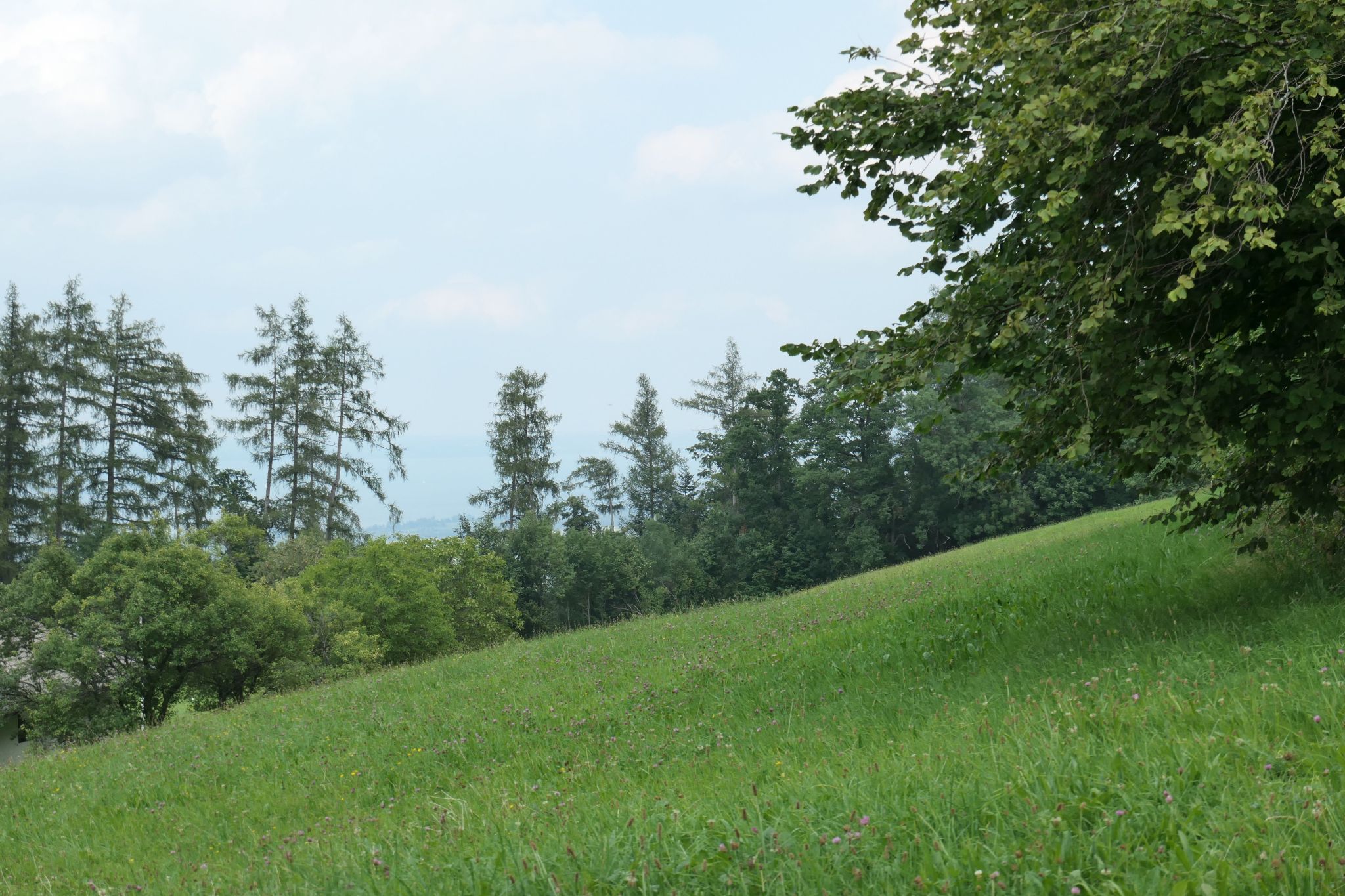 Hinter diversen geneigten Wiesen blitzt der Chiemsee durch – allerdings ist es zu diesig, als dass auf den Fotos mehr als nur hellblau zu erkennen ist…