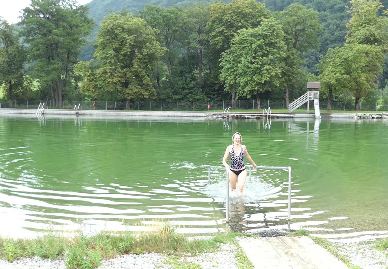 Die Menschenmengen rund um Aschau sind auffallend ungleich verteilt: Im Café Pauli stapeln sich alle, als gäbe es kein anderes Lokal weit und breit. Die Gastronomie an den Naturschwimmbädern bekommt höchstens eine Handvoll Gäste ab und im Wasser lande – nur ich. Wenn ich schon direkt neben einem kostenlosen, hübsch angelegten Badeteich campiere, dann springe ich natürlich auch rein!