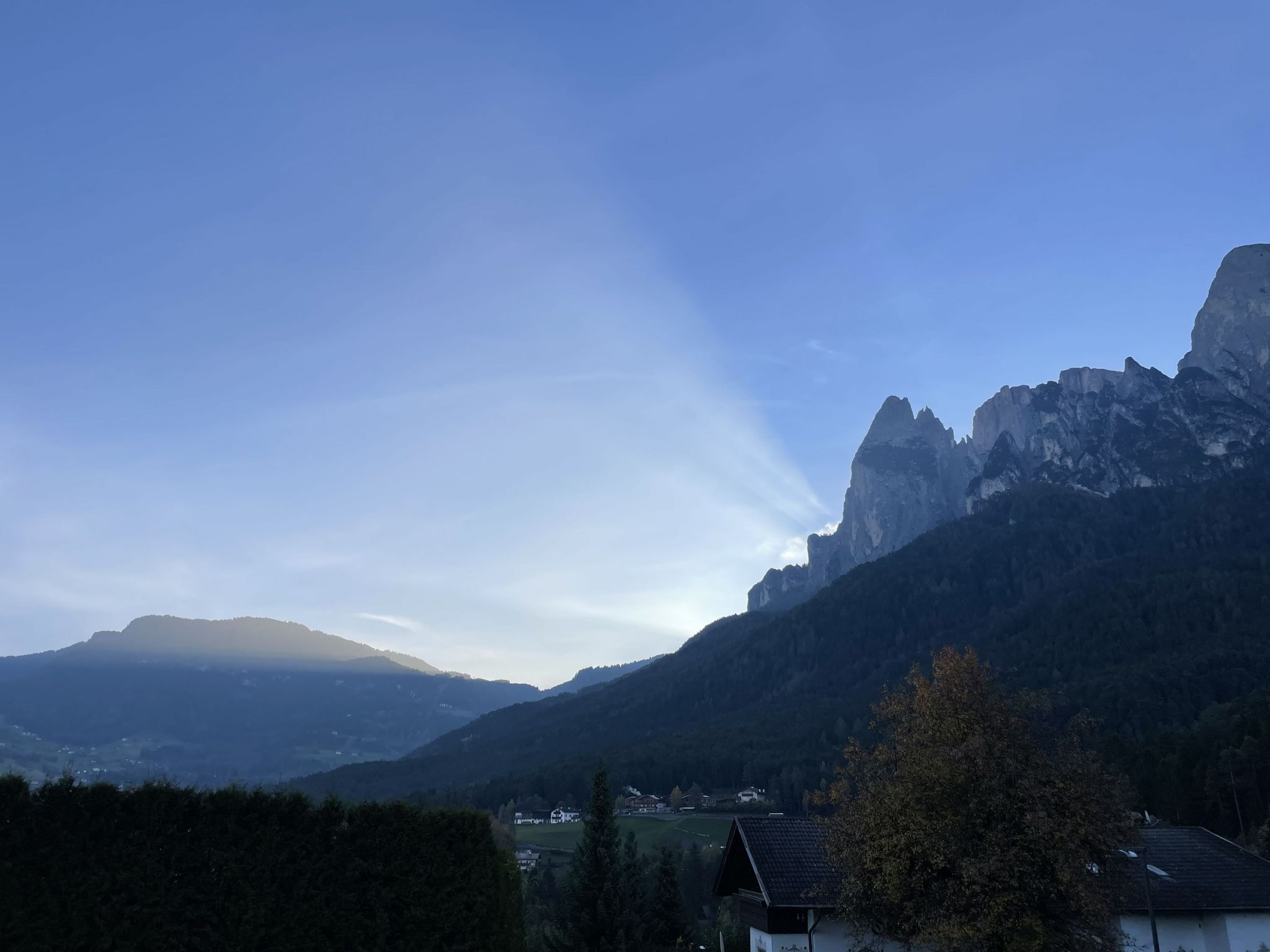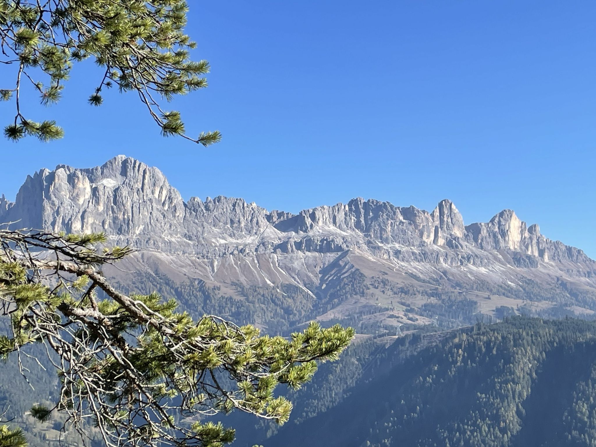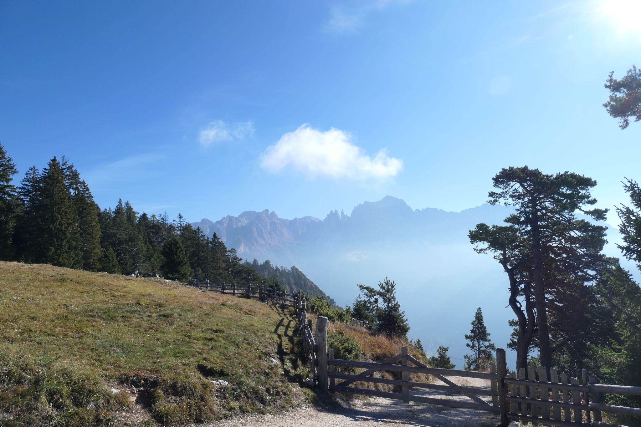 Bei St. Zyprian verlasse ich den Bus und starte sanft und lieblich bergauf. Die sonnigen Wiesen entlang des Wegs stehen in krassem Kontrast zu den aufragenden Felsen des Rosengartens. Auf italienisch heißt diese Kette ganz anders, was völlig okay ist, es sieht nämlich gar nicht aus wie ein Rosengarten.