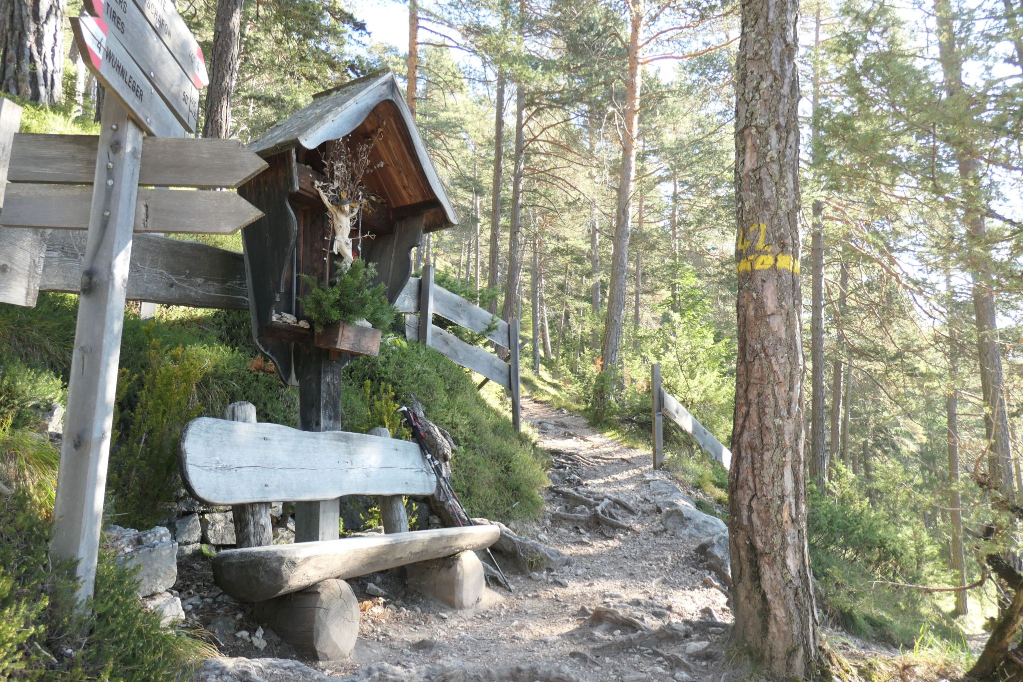 …und dann ist es geschafft! Als ich mich auf der Bank am Kreuz niederlasse merke ich trotz der Euphorie, dass ich seit drei Stunden durch die Bergwelt stapfe. Meistens bergauf, zuletzt zunehmend anspruchsvoll.