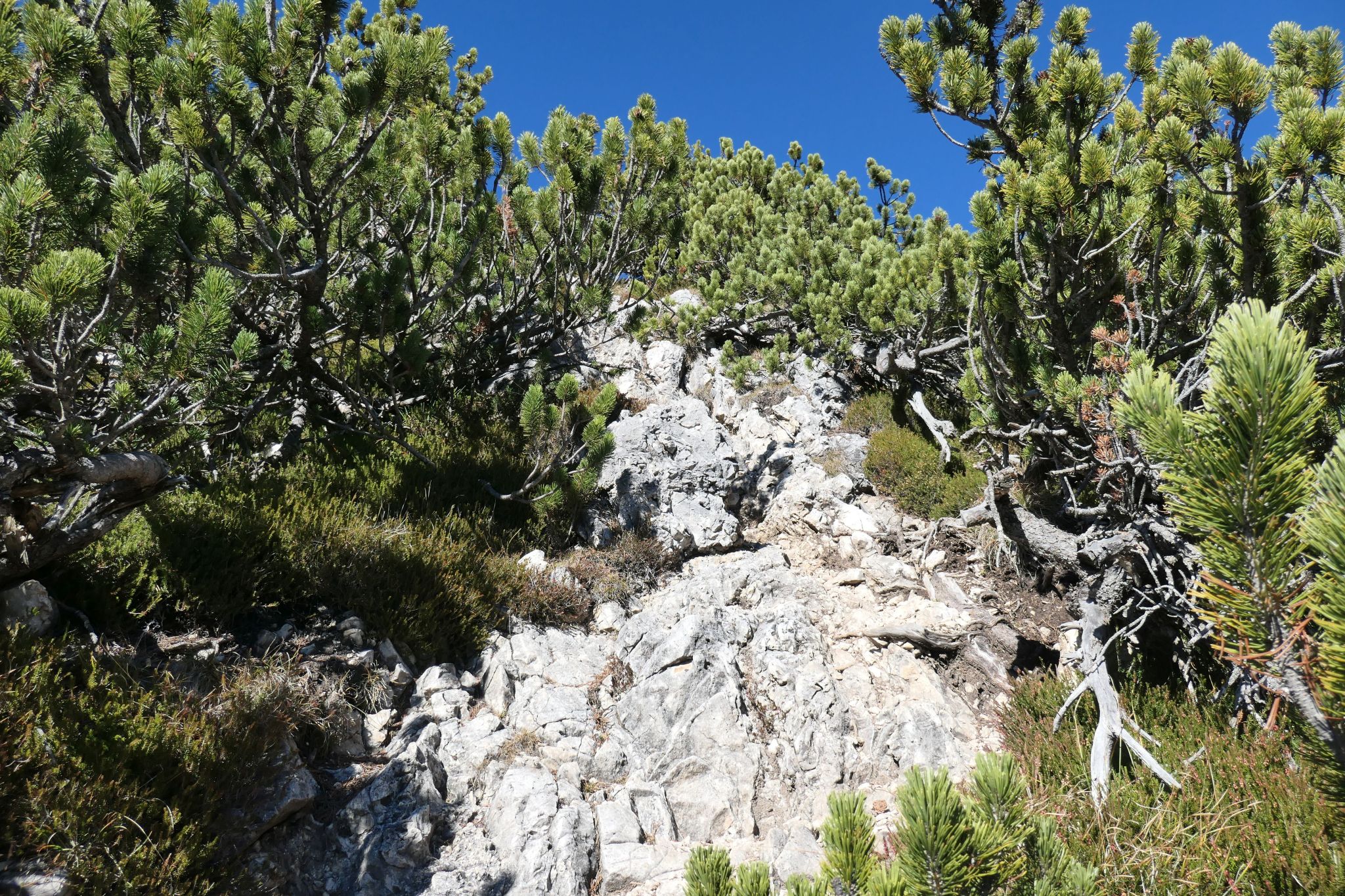 Kurz, nachdem der Pfad zu einer steinigen Herausforderung wird, liegt völlig unscheinbar der höchste Punkt vor mir. Keine Markierung, kein Kreuz markiert den eigentlichen Gipfel – es ist nur eine steinige Fläche umgeben von Latschenkiefern, von der aus man den besten Blick hat.