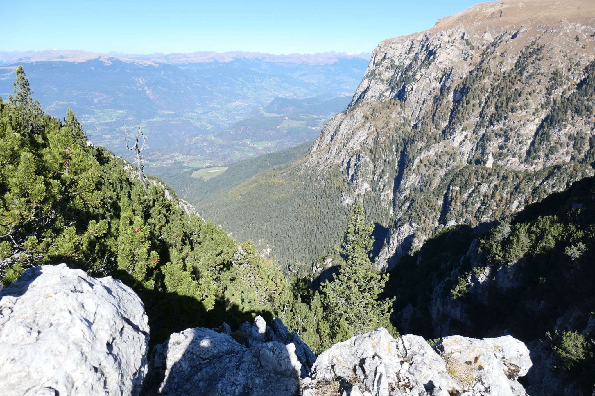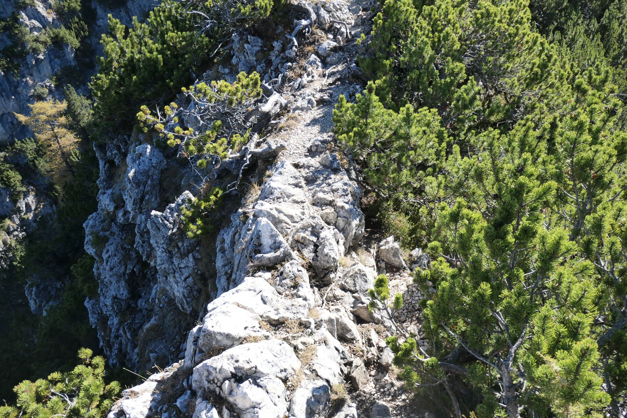 Erneut geht es bergab. Es ist sogar eine ziemliche Kraxelei, die ich aber erst auf dem Rückweg (bergauf blickend) aufnehme. Im Moment bin ich ziemlich beschäftigt damit, meine Wanderstöcke und alle Gliedmaßen heil voran zu bringen.